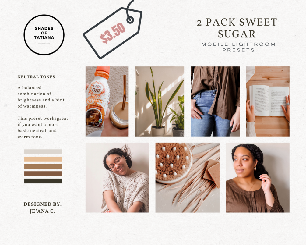 The Sweet Sugar Presets was crafted with bright & neutral tones. It’s a balanced combination of brightness and a hint of warmness. These presets work great if you want a more basic neutral or warm tone. Or just both!